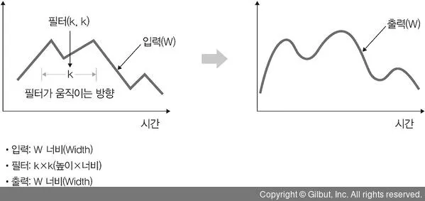 1D 합성곱은 필터가 시간을 축으로 좌우로만 이동할 수 있는 합성곱. 입력(W)과 필터(k)에 대한 출력은 W.