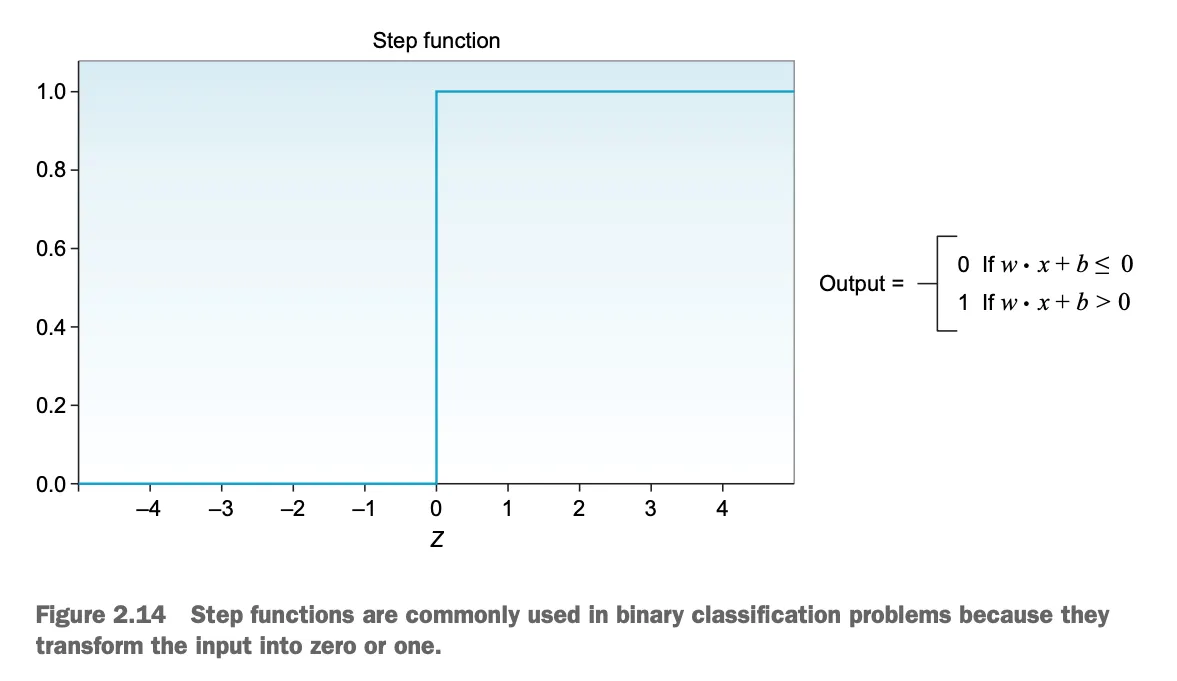 스텝 함수(step function)는 0과 1 두가지 값만 출력합니다. 입력이 이면 발화하고(1 출력), 그렇지 않으면 발화하지 않습니다(0 출력).