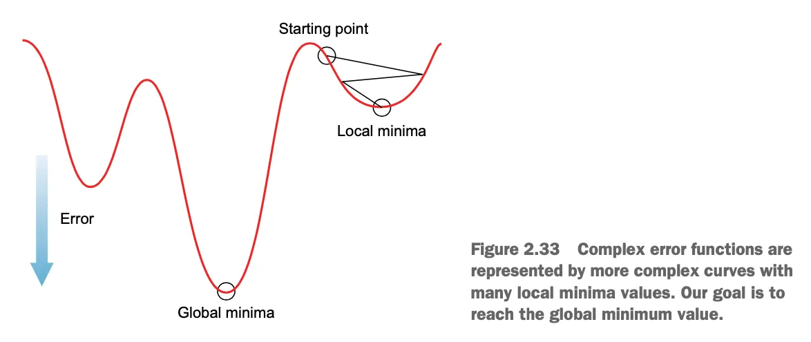 위 그림처럼 그래프 전체의 극소점이 아닌 지역 극소점(local minima)에 빠질 수 있습니다. 우리의 목표는 지역 극소점이 아닌 그래프 전체의 최소값에 해당하는 전역 최소점(global minima)입니다.