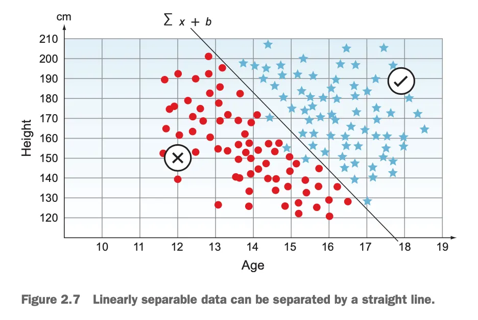 예를 들어 어떤 선수가 대학 팀에 들어갈 수 있을지 예측하는 퍼셉트론을 학습하려 한다고 합시다. 작년에 팀에 지원한 선수의 키와 나이 데이터를 모아 팀에 예측할 수 있는지 예측하는 퍼셉트론을 학습하고자 합니다. 합격한 지원자와 합격하지 못한 지원자를 잘 분리하는 직선(straight line)을 정의해야 합니다. 이 직선은 다음과 같은 식으로 정의됩니다.