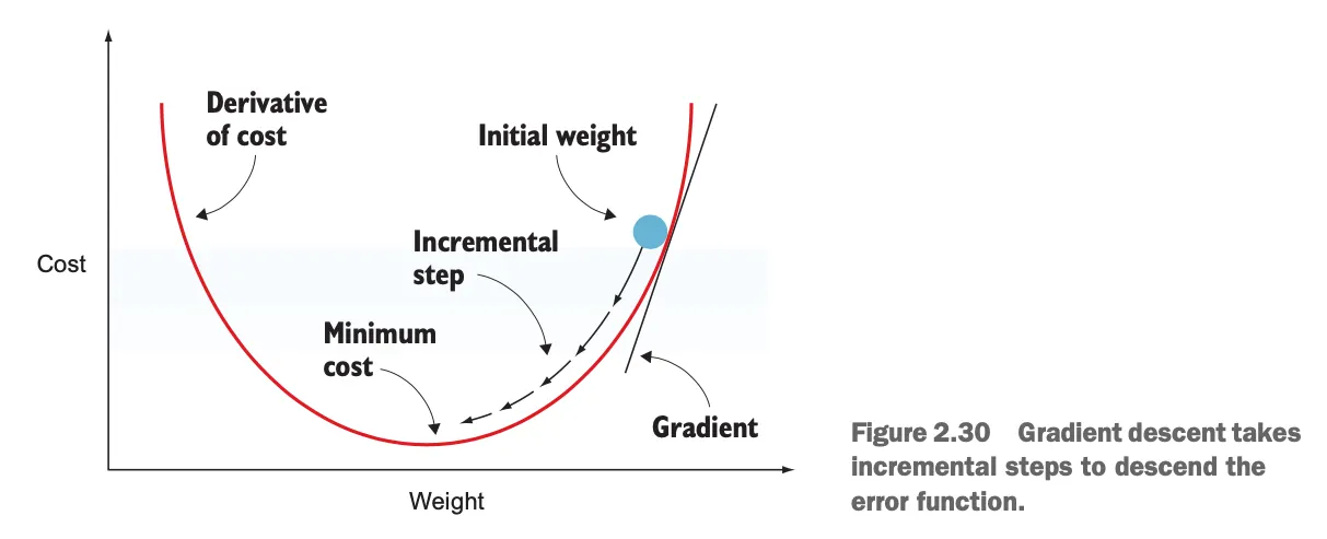 경사 하강법(gradient descent)은 간단히 설명하면 가중치를 반복적으로 수정하며 오차 함수의 최저점에 도달할 때까지 오차 함수의 언덕을 내려가는 과정입니다.