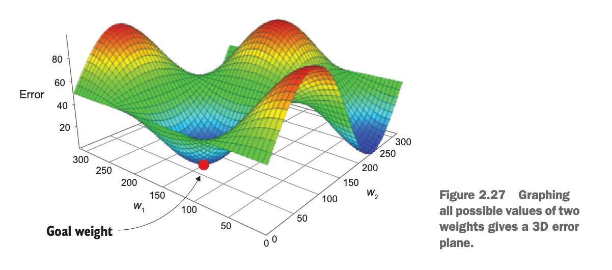 위 그림에서 Goal weight(global minimum)을 찾는 것과 같습니다. 사람의 인지감각으로는 3차원 이상의 공간을 이해하기 어려워 가중치가 3개 이상인 것 부터는 그림으로 표현하긴 어렵습니다.