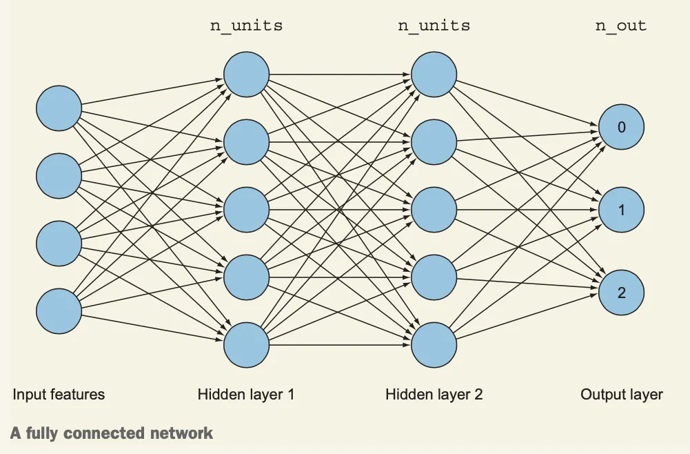 신경망은 많은 수의 뉴런으로 이뤄져 있으며 이들 뉴런은 층 모양으로 배열되어 출력을 예측하기 위한 계산을 수행합니다. 이러한 구조를 다층 퍼셉트론(multilayer perceptron)이라고 부릅니다.