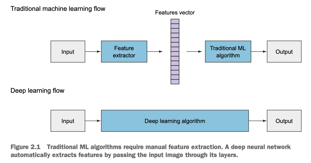 컴퓨터 비전 파이프라인은 (1) 이미지 입력, (2) 전처리, (3) 특징 추출, (4) 학습 알고리즘(분류기) 단계로 구성됩니다. 고전적인 머신러닝 알고리즘에서는 알고리즘에 입력할 특징 벡터의 추출 방법을 사람이 직접 정의해야 하지만, 딥러닝에서는 신경망이 추출과 분류의 역할을 모두 수행하기 때문에 그럴 필요가 없습니다.