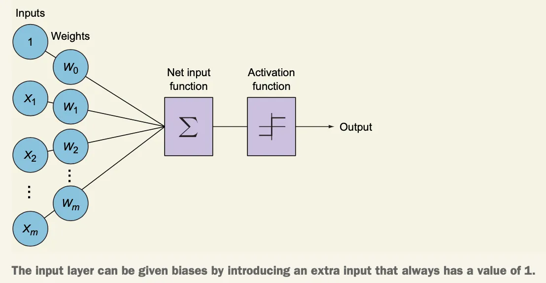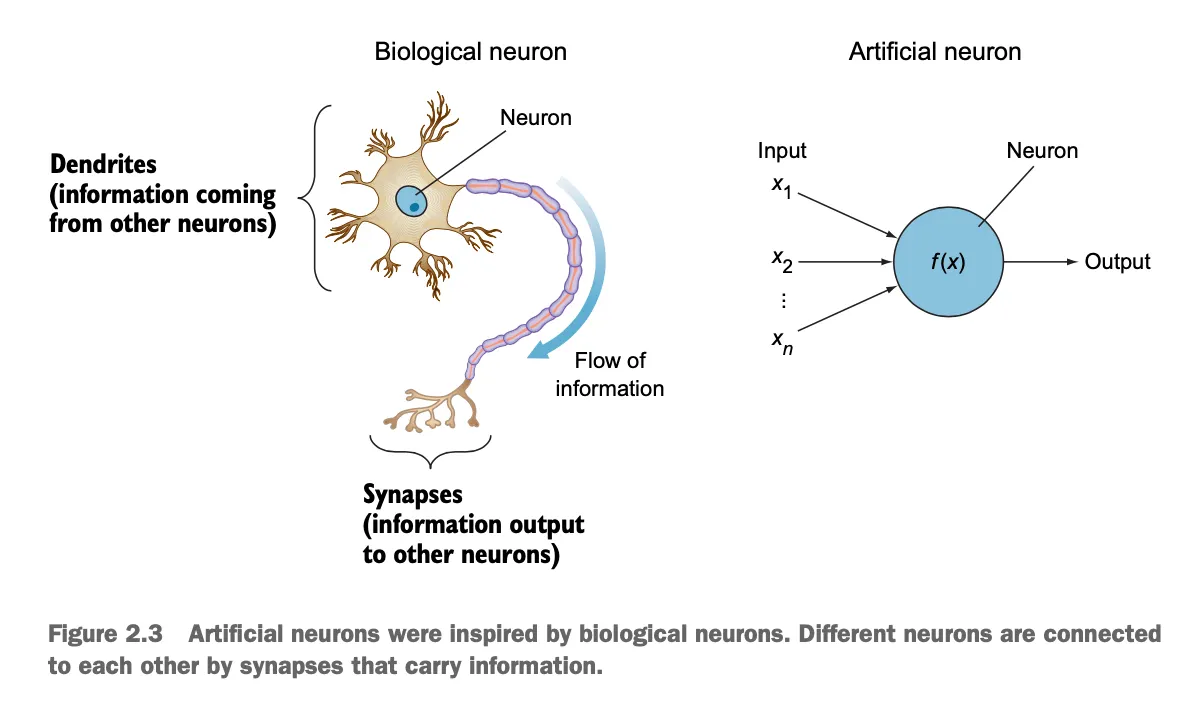 생물학적 뉴런은 여러 개의 수상돌기(dendrite)로부터 서로 다른 세기의 전기적인 신호를 받고 이 신호 세기의 합이 정해진 입계값을 넘으면 시냅스(synapse)를 통해 출력 신호를 보냅니다. 이 출력은 또 다른 뉴런으로 연결되어 같은 과정을 반복합니다.