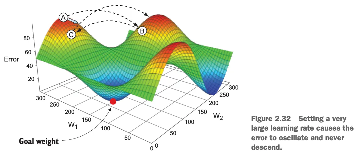 위 그림처럼 학습률(즉, 보폭)이 너무 크면 A,B,C 지점으로 이동하는 것 처럼 오차값이 진동(oscillating)하기만 할 뿐 감소하지 않게 됩니다.