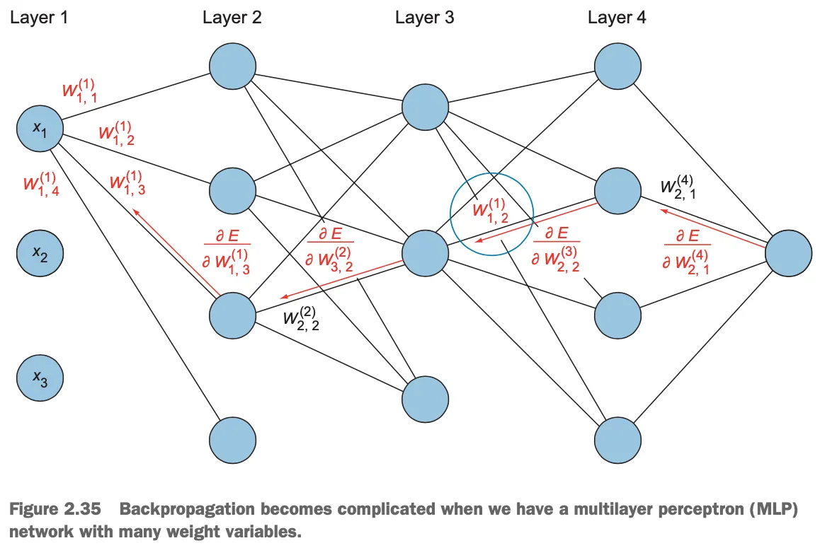 그림 2.35에서는 다음과 같은 방식으로 의 가중치를 업데이트 하기 위한 미분을 진행할 수 있습니다.