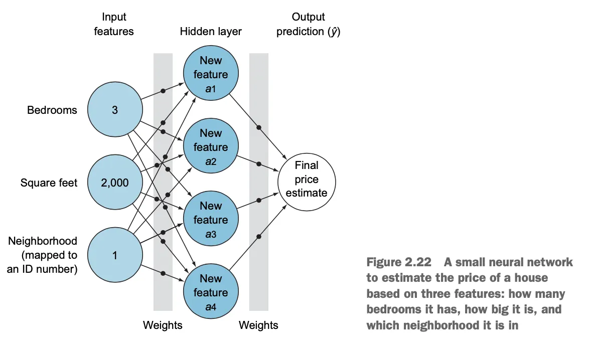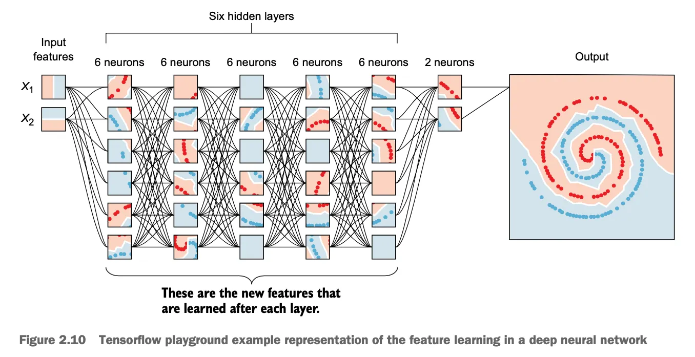 은닉층은 특징이 실제로 학습되는 곳입니다. 위 그림에서 앞쪽 층의 노드는 비교적 간단한 구상적인 특징(직선)을 학습한 데 비해 뒤로 갈수록 도형 같은 복잡한 패턴의 패턴의 패턴으로 점점 복잡한 특징을 학습합니다. 이러한 개념은 나중에 배우게 될 합성곱 신경망에서 유용하게 쓰입니다.