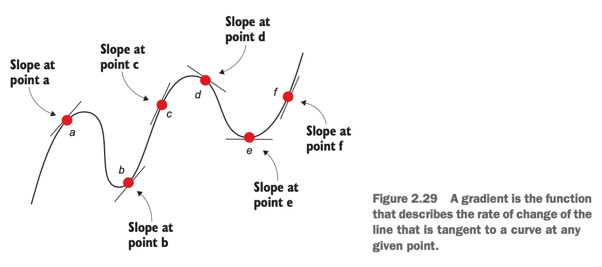 경사(gradient, 미분(derivative)이라고도 한다)의 일반적인 정의는 주어진 지점에서 곡선에 대한 접선이 갖는 변화율 또는 기울기를 알려주는 함수입니다.