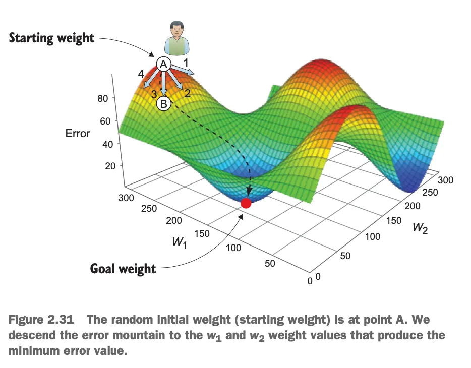 경사 하강법의 원리를 시각적으로 나타내볼까요? 아래 그림처럼 A는 무작의로 결정된 위치고, 우리의 목표는 함수 그래프의 언덕을 내려가 오차 함수값이 최소가 되는 가중치 과 에 도달하는 것입니다.