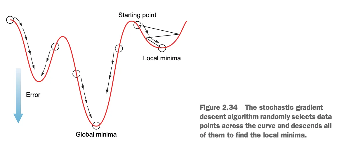 확률적 경사 하강법(stochastic gradient descent, SGD)은 무작위로 데이터 점을 골라 데이터 점 하나를 이용해 가중치를 수정합니다.