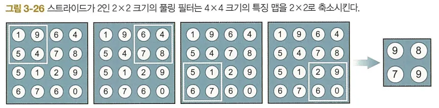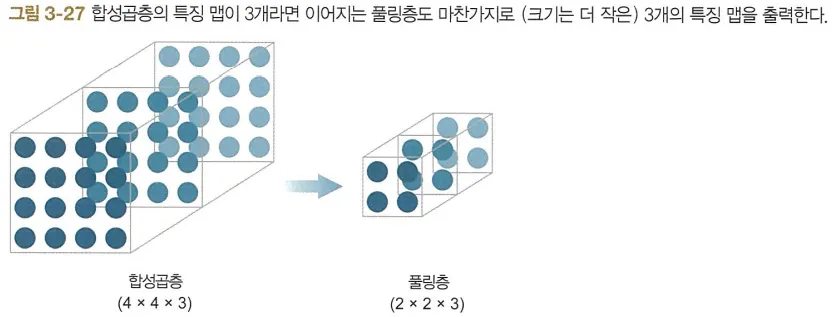 합성곱층이 출력한 모든 특징 맵에 풀링을 적용하면 특징 맵의 크기는 작아지지만 개수는 유지된다.