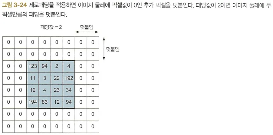 패딩(padding) : 흔히 말하는 제로패딩(zero-padding)은 이미지 둘레에 픽셀값이 0인 추가 픽셀을 덧붙이는 것을 말한다.