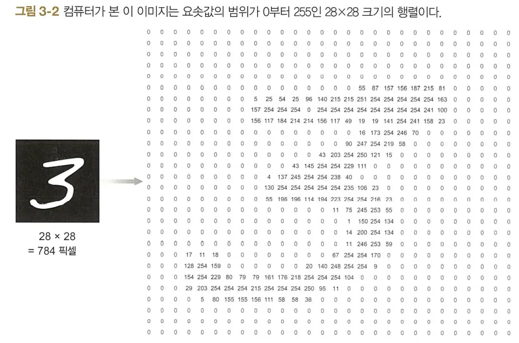 컴퓨터는 [그림 3-2]의 왼쪽 손글씨 이미지를 오른쪽 28x28 행렬로 인식한다.