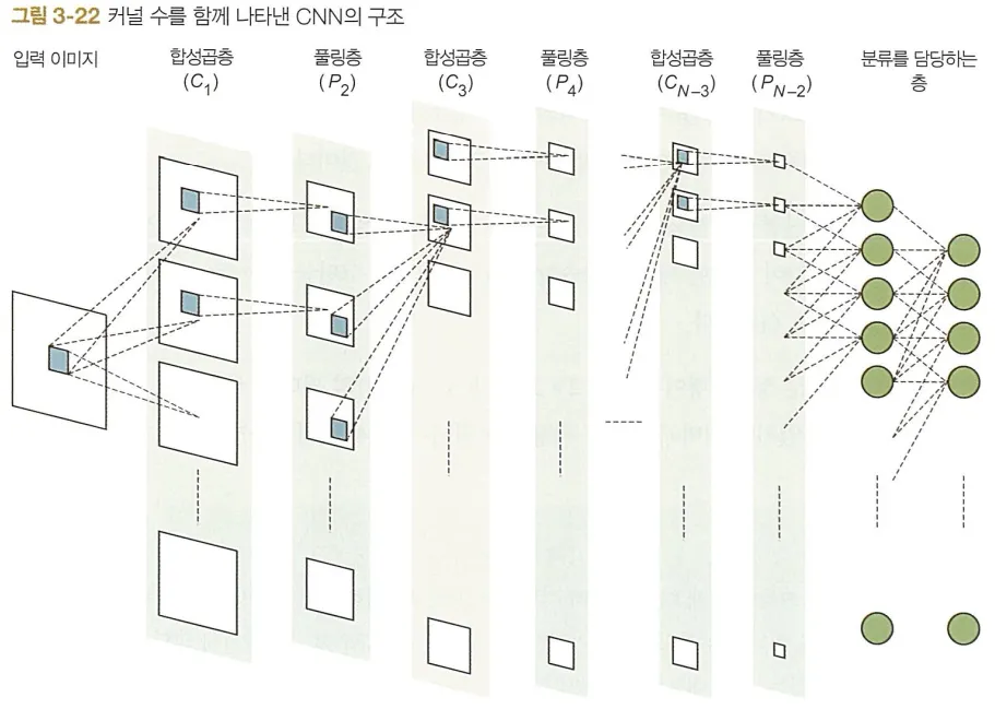 [그림 3-22]는 커널 수를 함께 나타낸 CNN의 구조다.