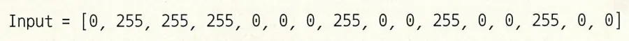 픽셀값 0이 검정색, 255가 흰색이라고 하면 이 입력 벡터는 다음과 같다.