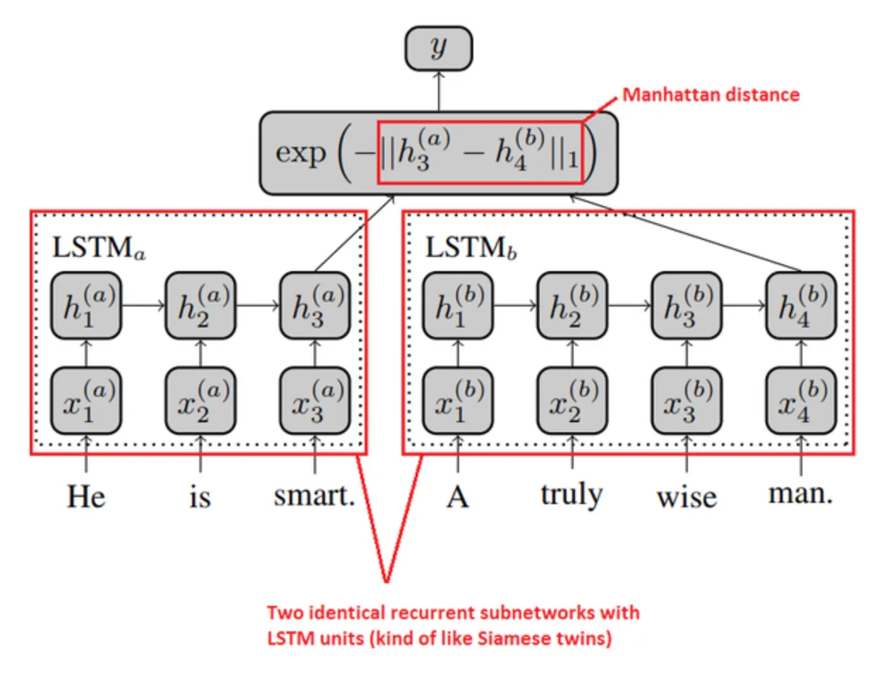 각 문장을 각 네트워크(임베딩 + LSTM)에 통과시킨 후 최종 출력 벡터 사이의 맨해튼 거리를 측정해 최종 충력값으로 뽑는 구조입니다.